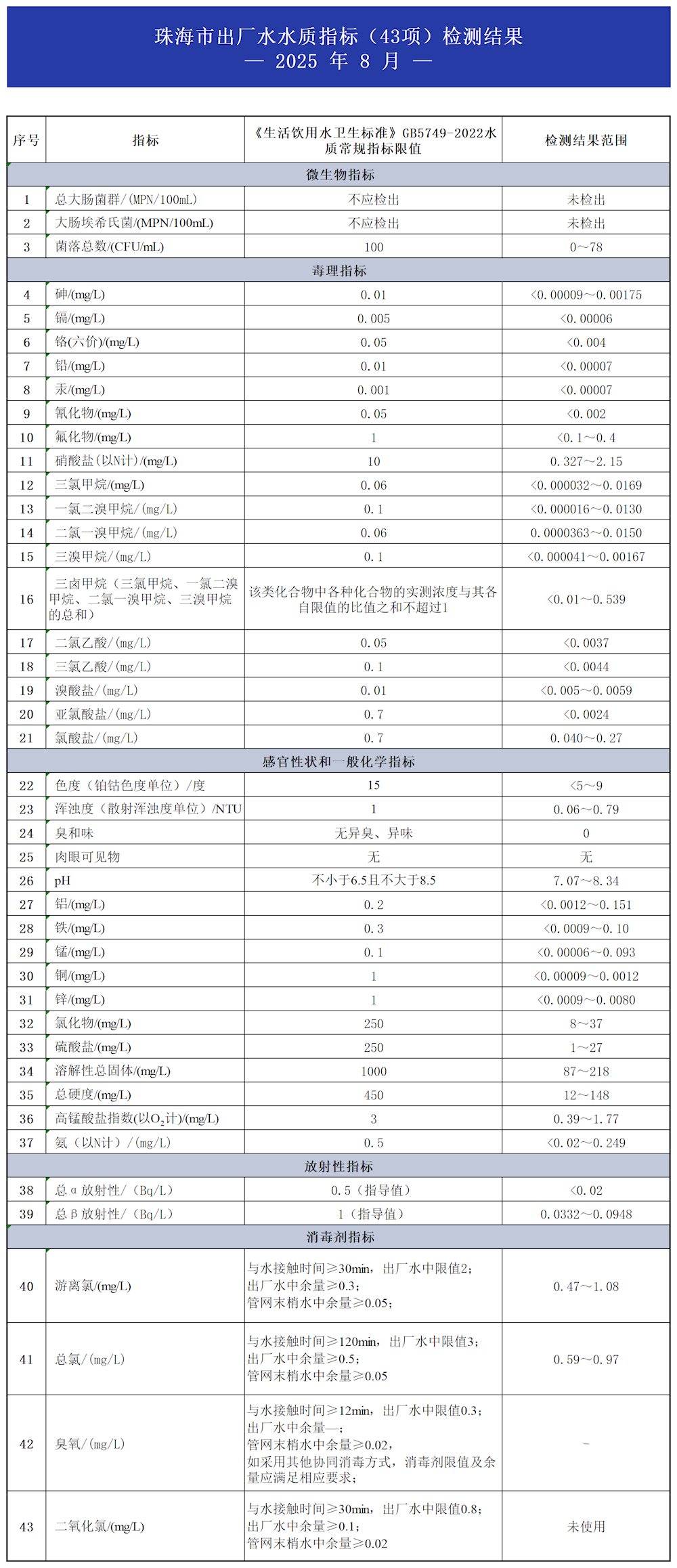 2025年8月珠海市出廠水水質(zhì)指標(biāo)(43項(xiàng))檢測結(jié)果 發(fā)布時(shí)間:2025年09月15日 瀏覽次數(shù): 次 小大 原文下載:2025年8月珠海市出廠水水質(zhì)指標(biāo)(43項(xiàng))檢測結(jié)果.xls 【打印正文】